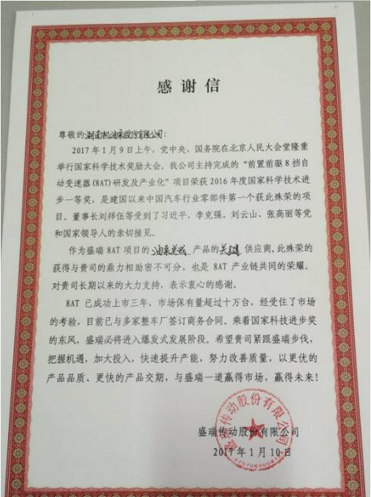 盛瑞传动“8AT变速箱泵”创新结构设计,采用油泵与变速器的定位销与外圆新型安装方法,减小了压力脉冲幅值、降低运行噪音、降低了装配成本。技术处于国际先进水平,为其配套生产的8AT自动变速器研发及产业化项目荣获国家科技进步一等奖。