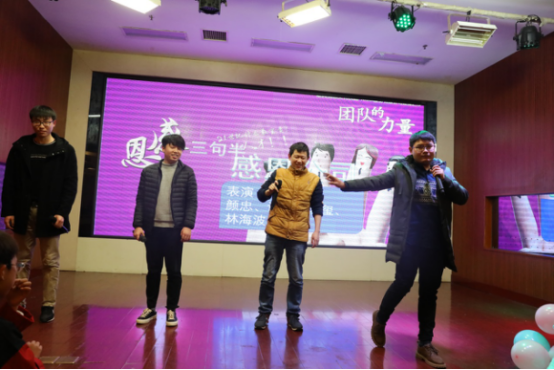 接下来是由我公司制造技术部表演的三句小品《感恩公司》,以幽默的话语为我们诠释感恩的力量。生活需要一颗感恩的心来创造,一颗感恩的心需要生活来滋养。在即将过去的2017年感谢父母,把我们养育成人. 感谢在座的各位前辈、师傅们。感谢我们的公司,给予我们一个发展的平台,感谢公司培养的锻炼,让我们在人生的道路上越走越远。