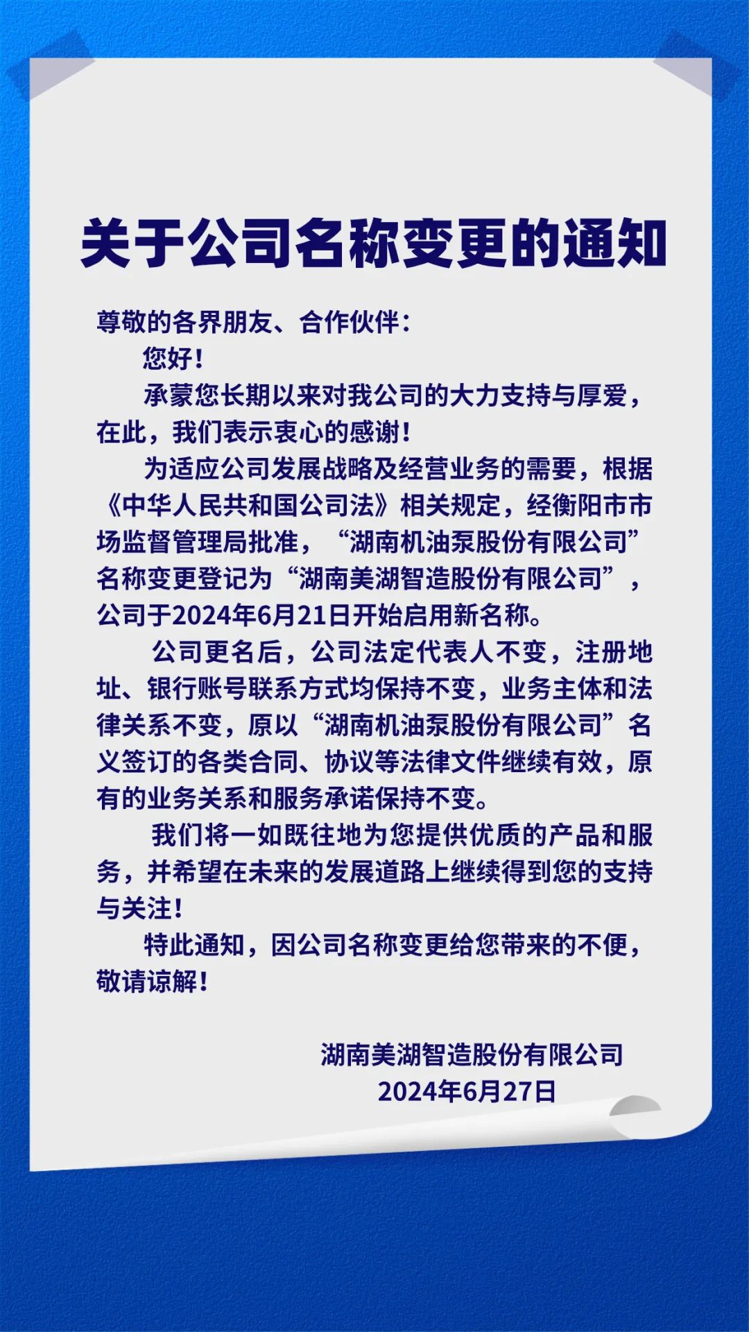湖南机油泵股份有限公司变更为usdt充值娱乐场智造股份有限公司的通知