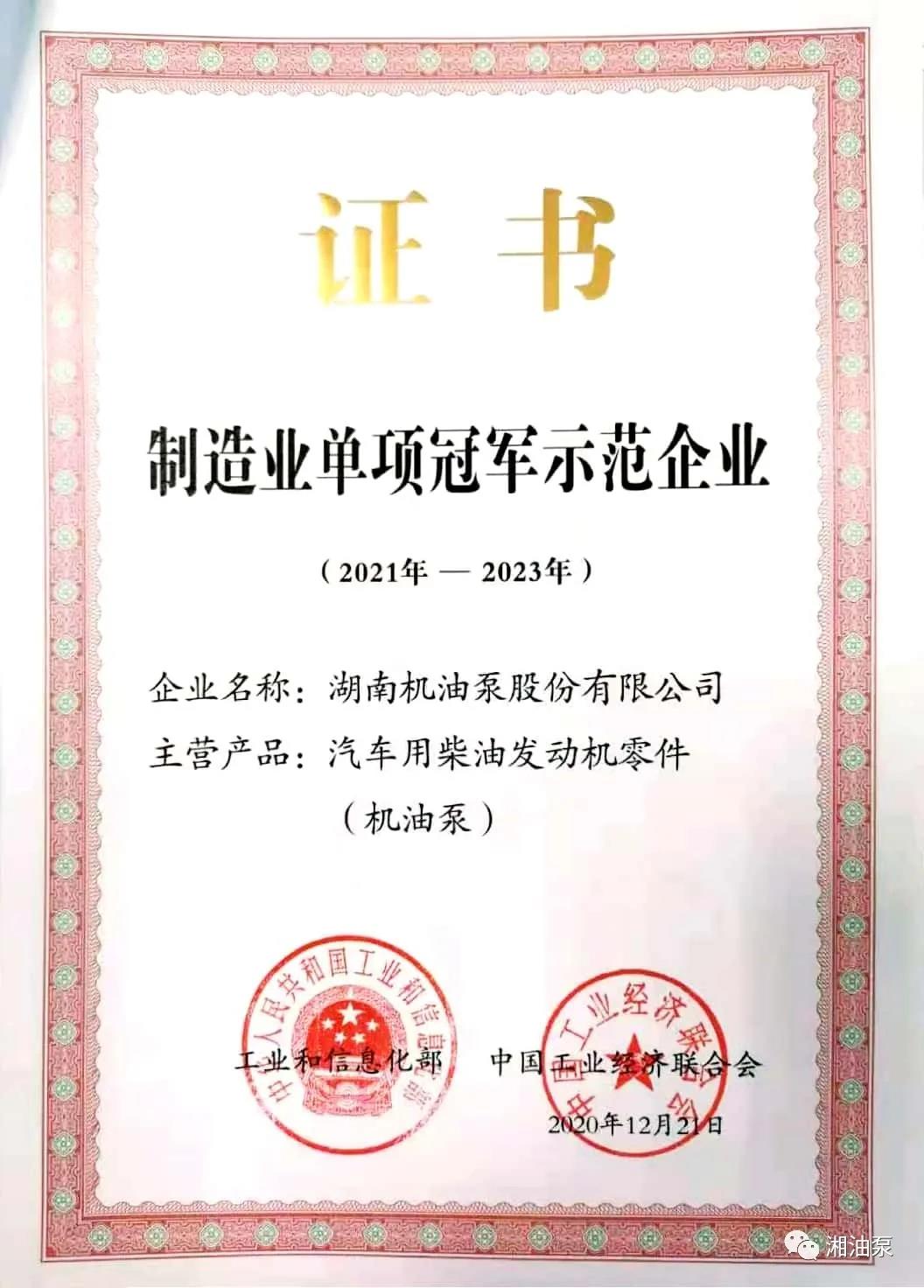 湖南机油泵股份有限公司被授予制造业单项冠军示范企业